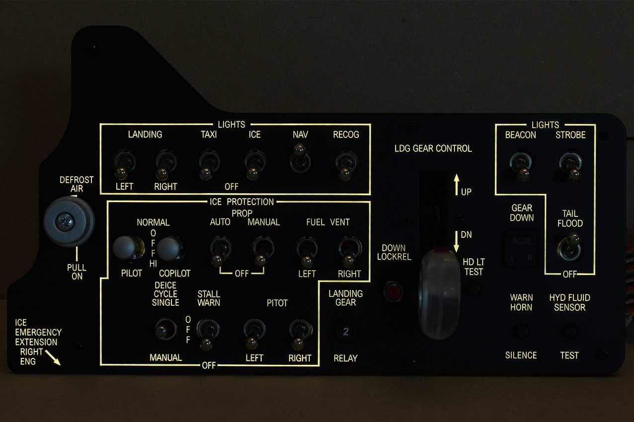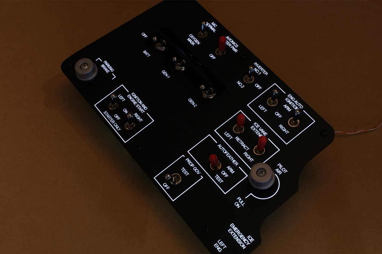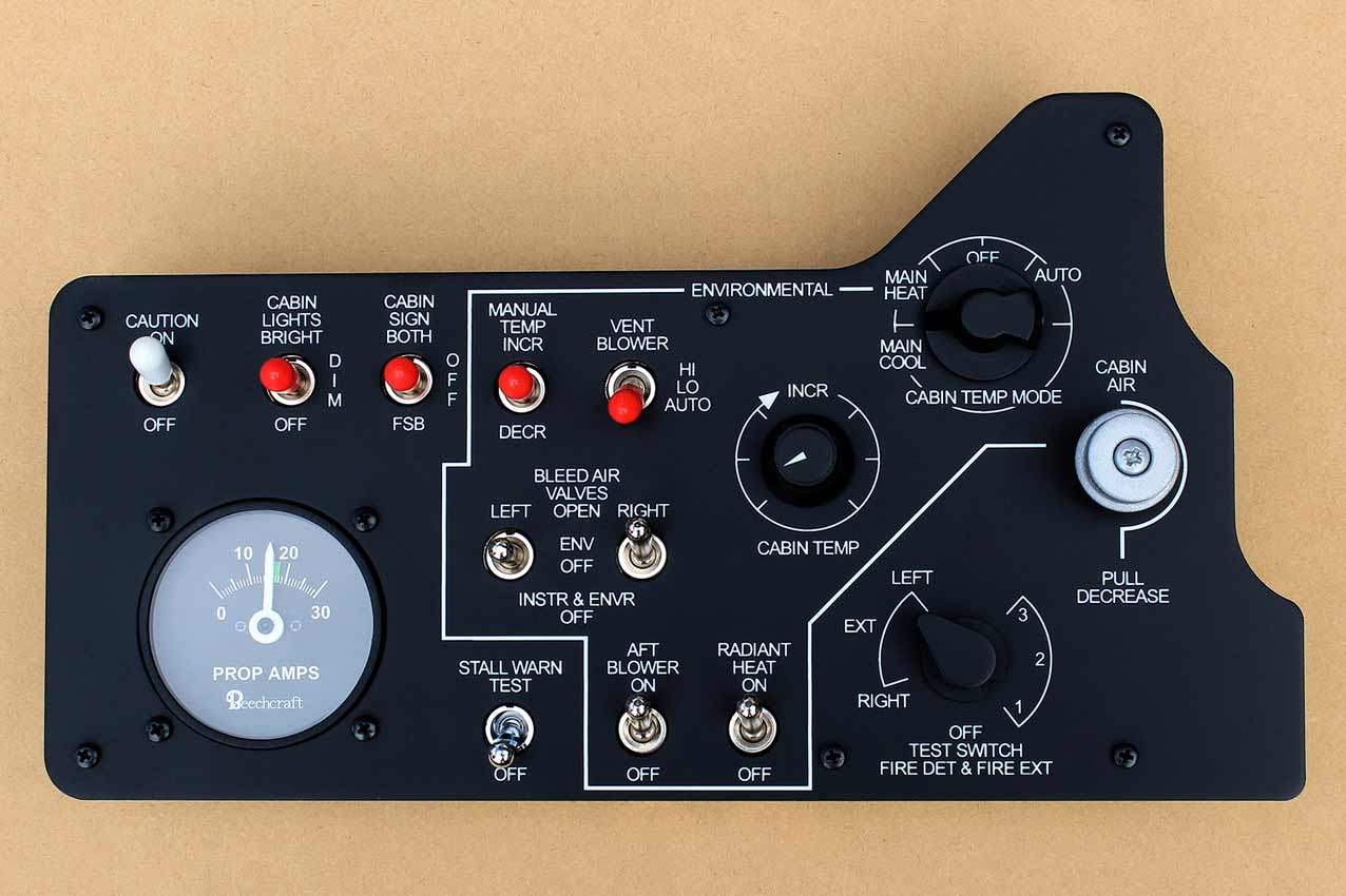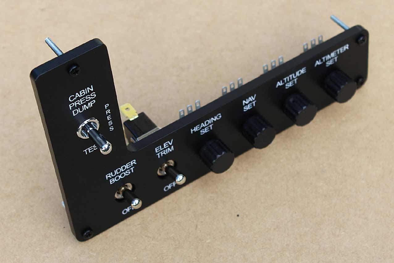 When supplied as a fully-assembled unit, this fully-backlit panel will include all of the switches (both the locking-lever and standard toggle versions), the black mounting screws, connection wires for the 12V backlighting, a dummy gauge, a pull on/push off switch, the Cabin Air knob, and knobs for the Cabin Temp, Cabin Temp Mode, and Fire Det & Fire Extinguisher. Please note that the hole for the gauge is suitable for a GSA-057 gauge from Flight Illusion.