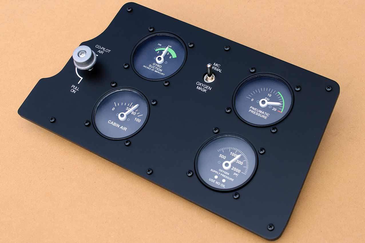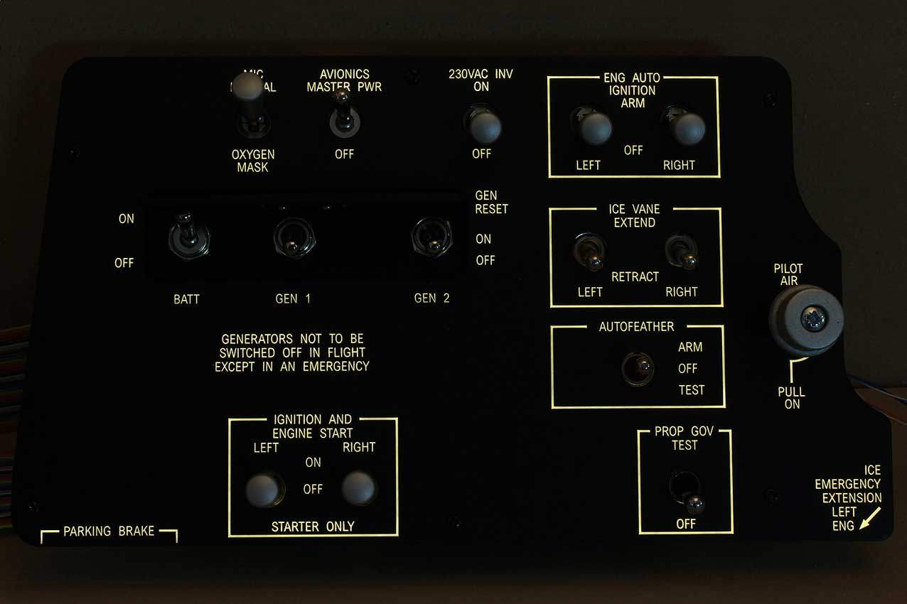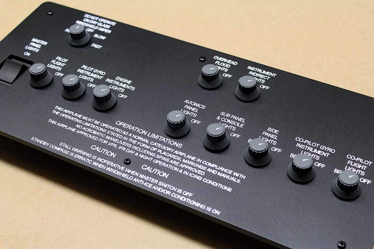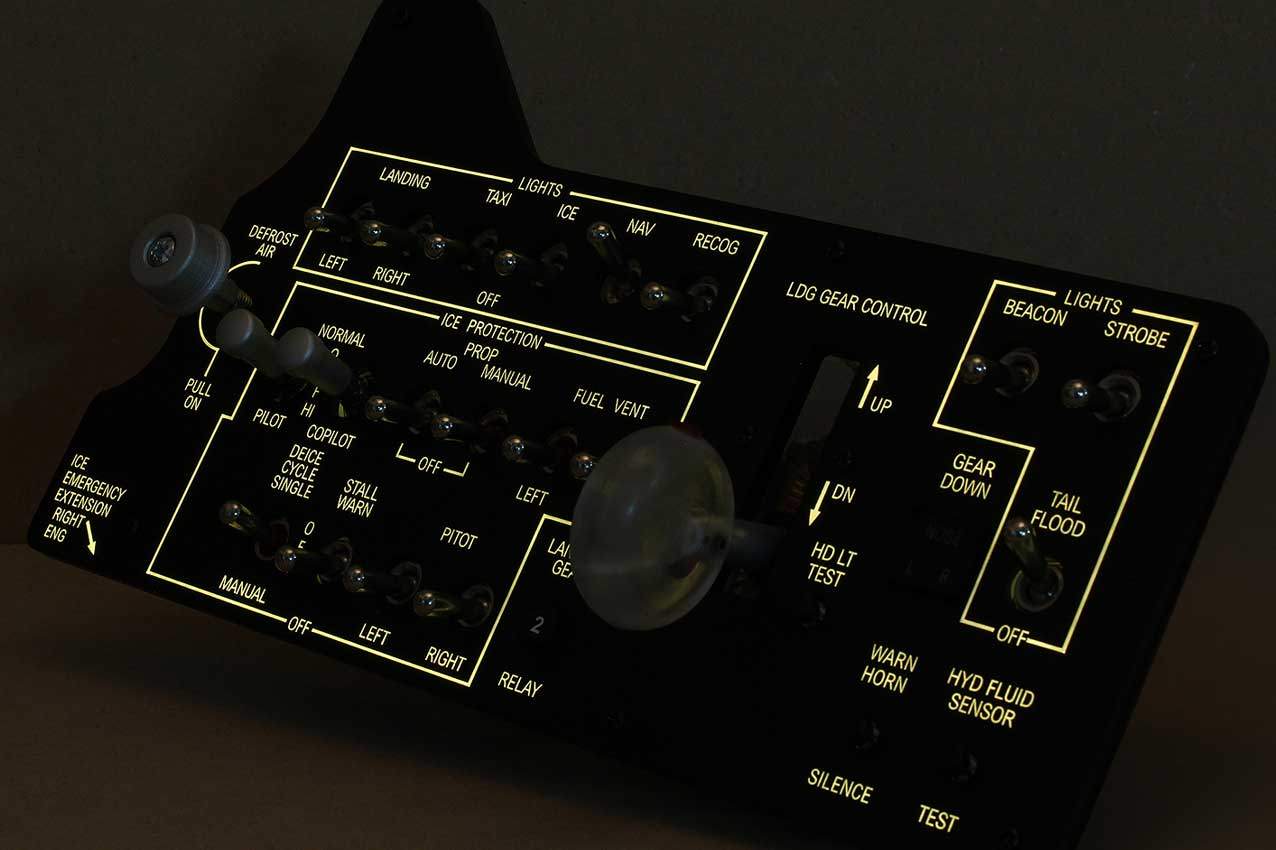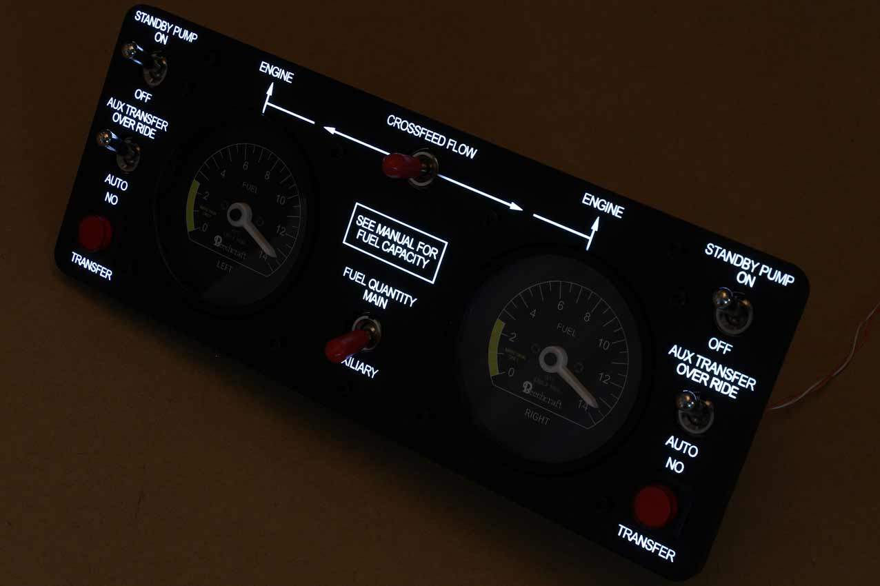 When supplied as a fully-assembled unit, this fully-backlit panel will include all of the switches (both the locking-lever and standard toggle versions), the black mounting screws, connection wires for the 12V backlighting, a dummy gauge, a pull on/push off switch, the Cabin Air knob, and knobs for the Cabin Temp, Cabin Temp Mode, and Fire Det & Fire Extinguisher. Please note that the hole for the gauge is suitable for a GSA-057 gauge from Flight Illusion.