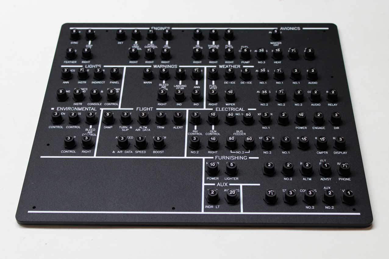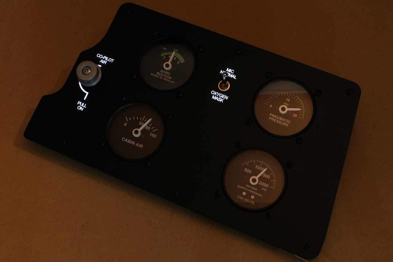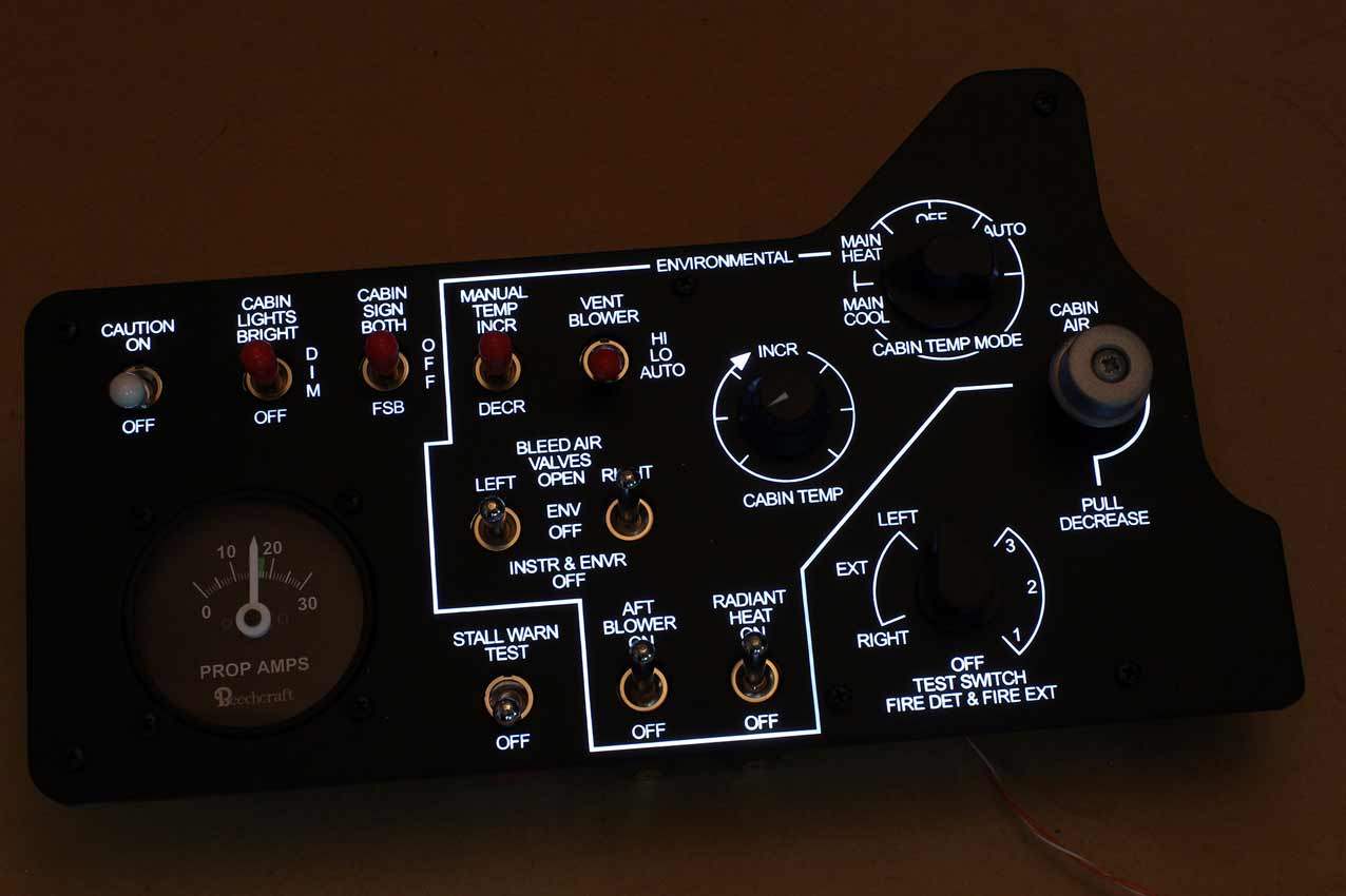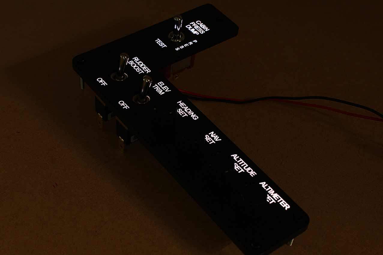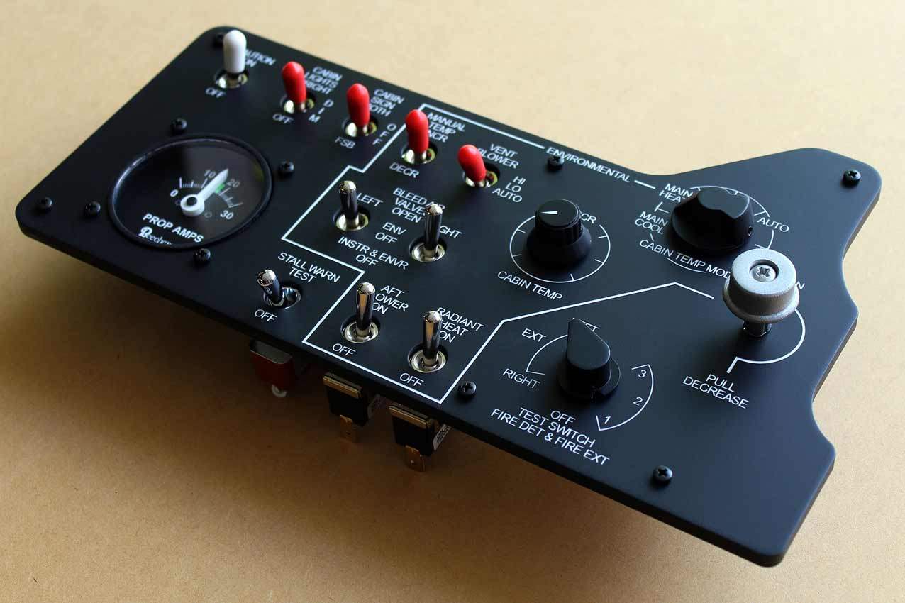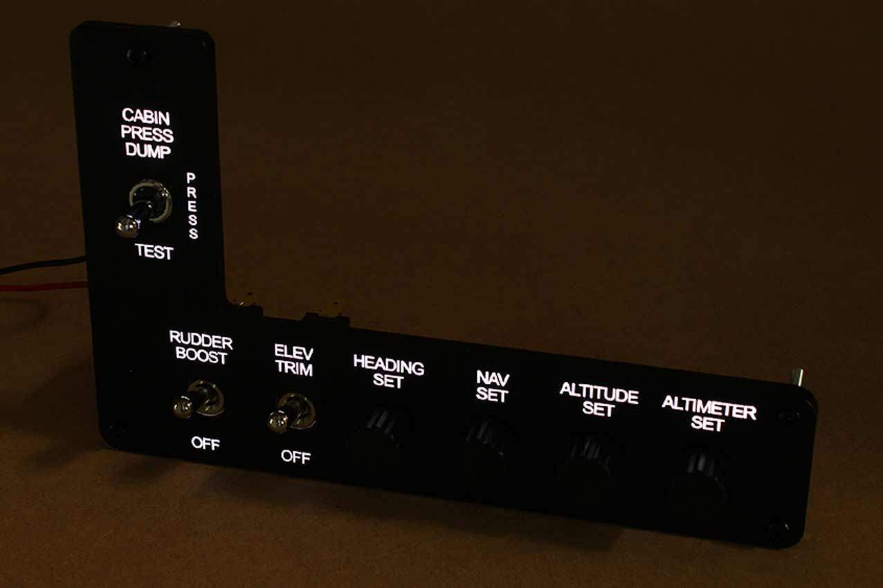 When supplied as a fully-assembled unit, this fully-backlit panel will include all of the switches (both the locking-lever and standard toggle versions), the black mounting screws, connection wires for the 12V backlighting, a dummy gauge, a pull on/push off switch, the Cabin Air knob, and knobs for the Cabin Temp, Cabin Temp Mode, and Fire Det & Fire Extinguisher. Please note that the hole for the gauge is suitable for a GSA-057 gauge from Flight Illusion.