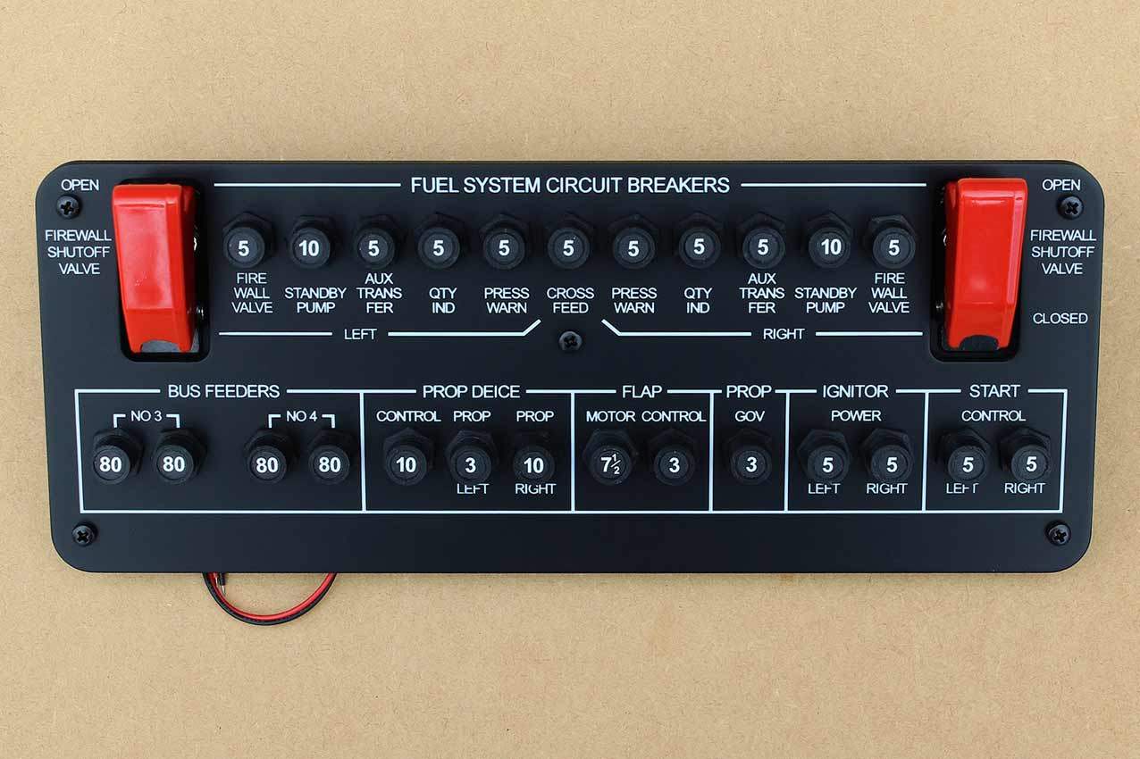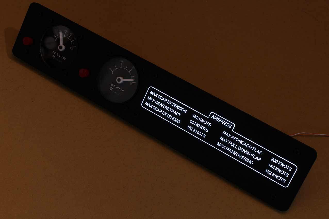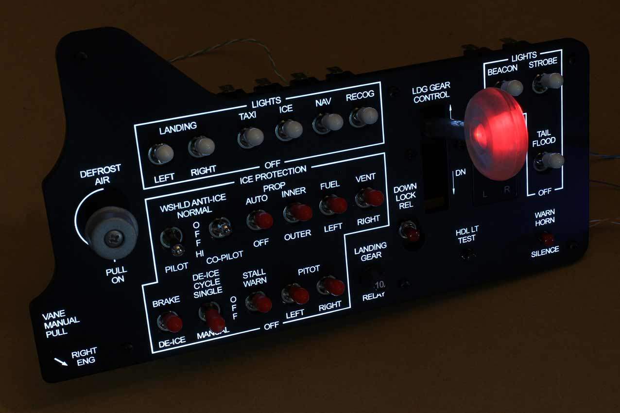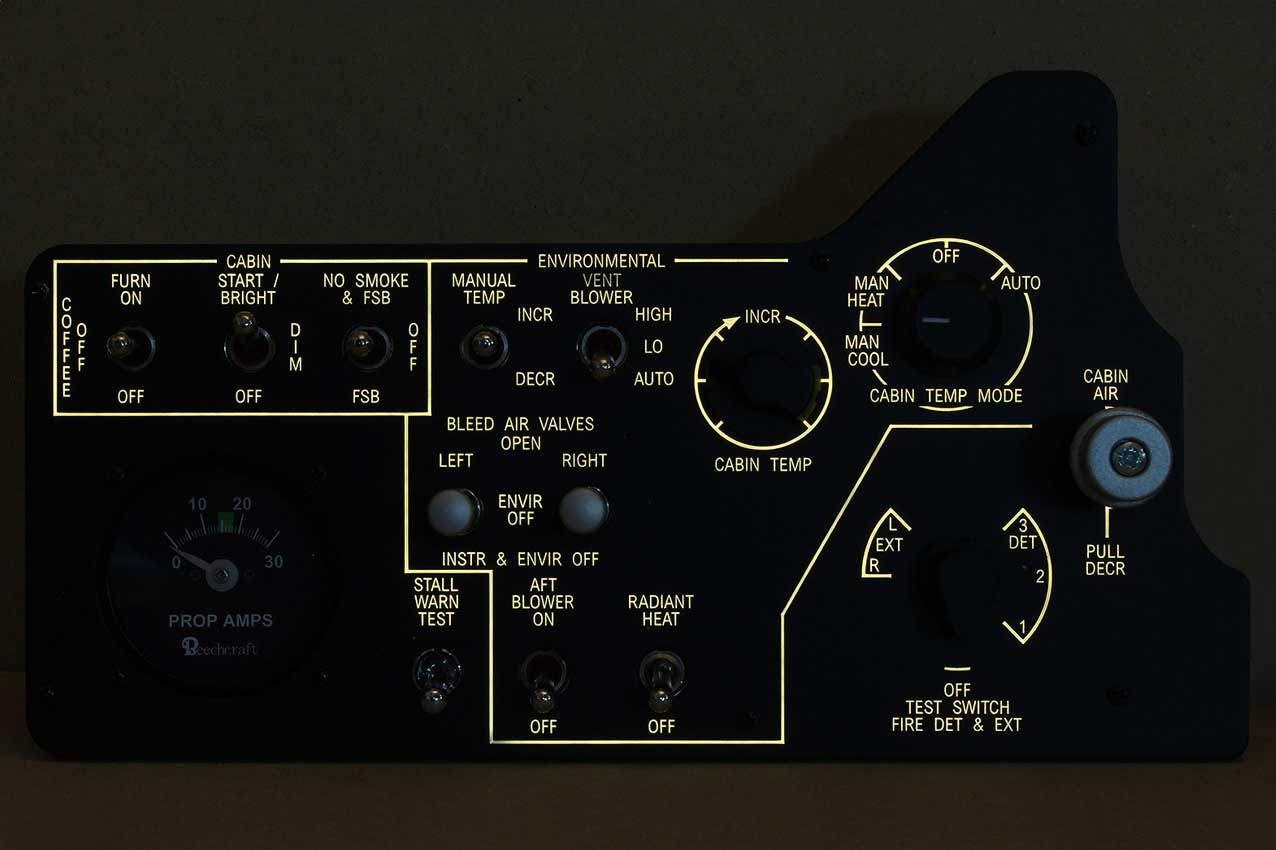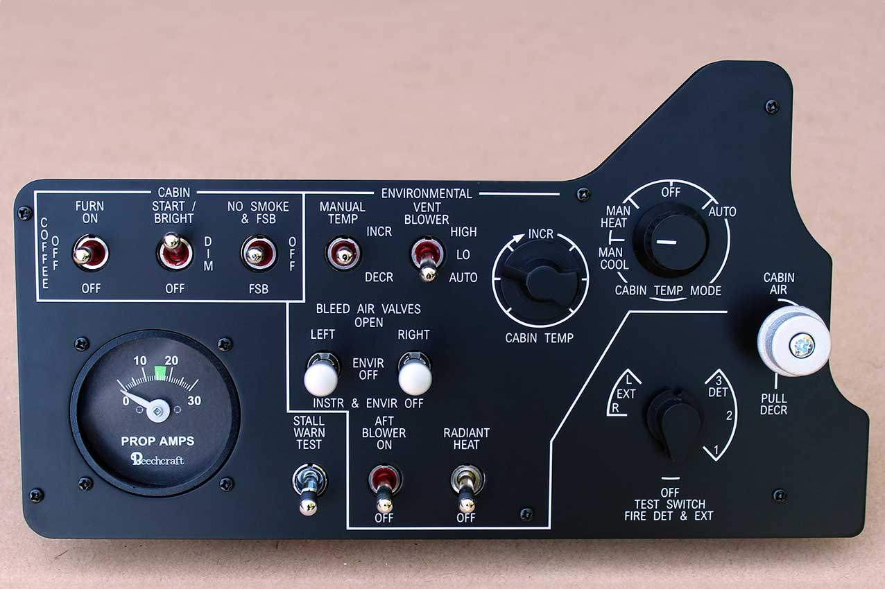 When supplied as a fully-assembled unit, this fully-backlit panel will include all of the switches (both the locking-lever and standard toggle versions), the black mounting screws, connection wires for the 12V backlighting, a dummy gauge, a pull on/push off switch, the Cabin Air knob, and knobs for the Cabin Temp, Cabin Temp Mode, and Fire Det & Fire Extinguisher. Please note that the hole for the gauge is suitable for a GSA-057 gauge from Flight Illusion.