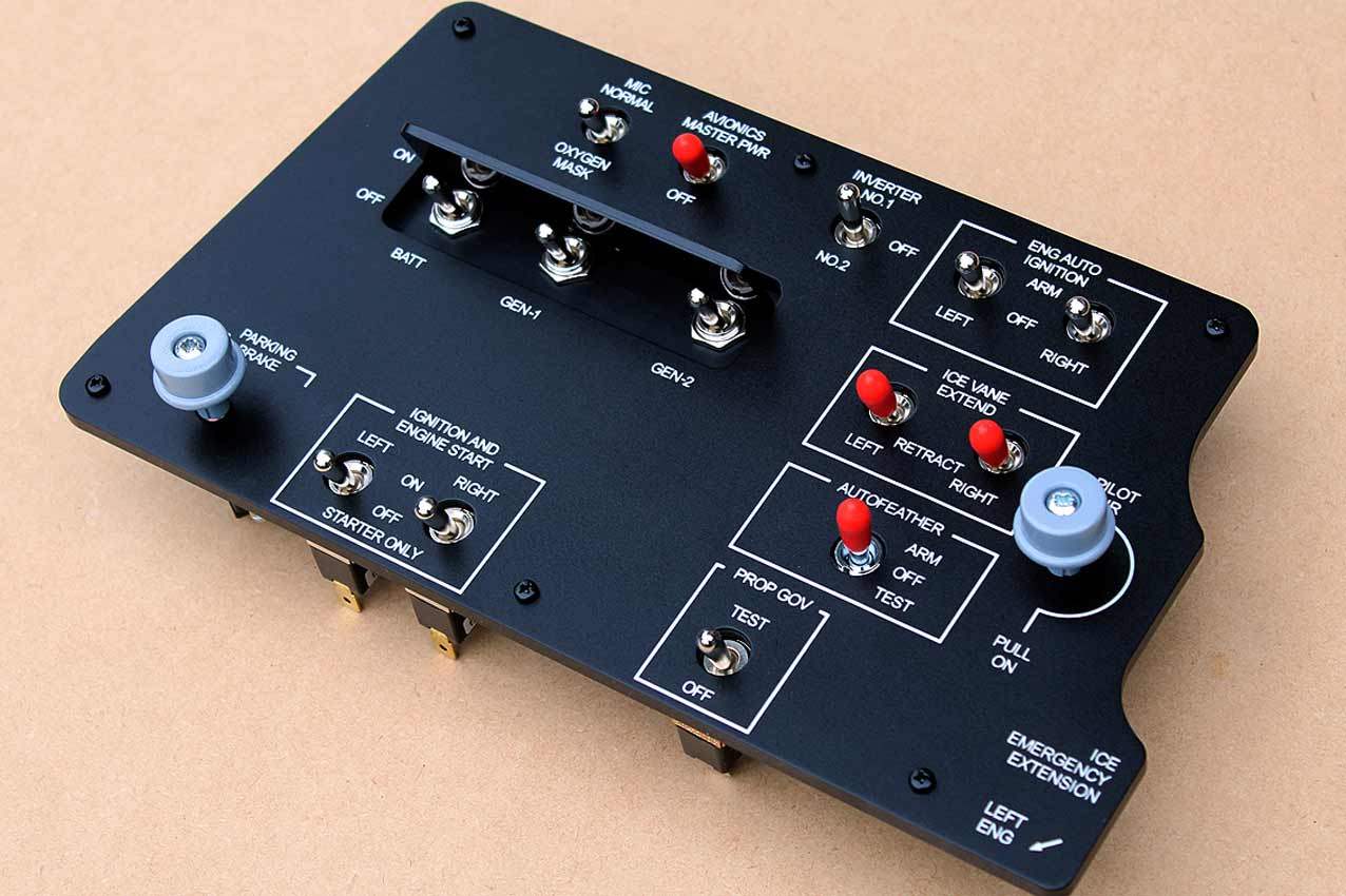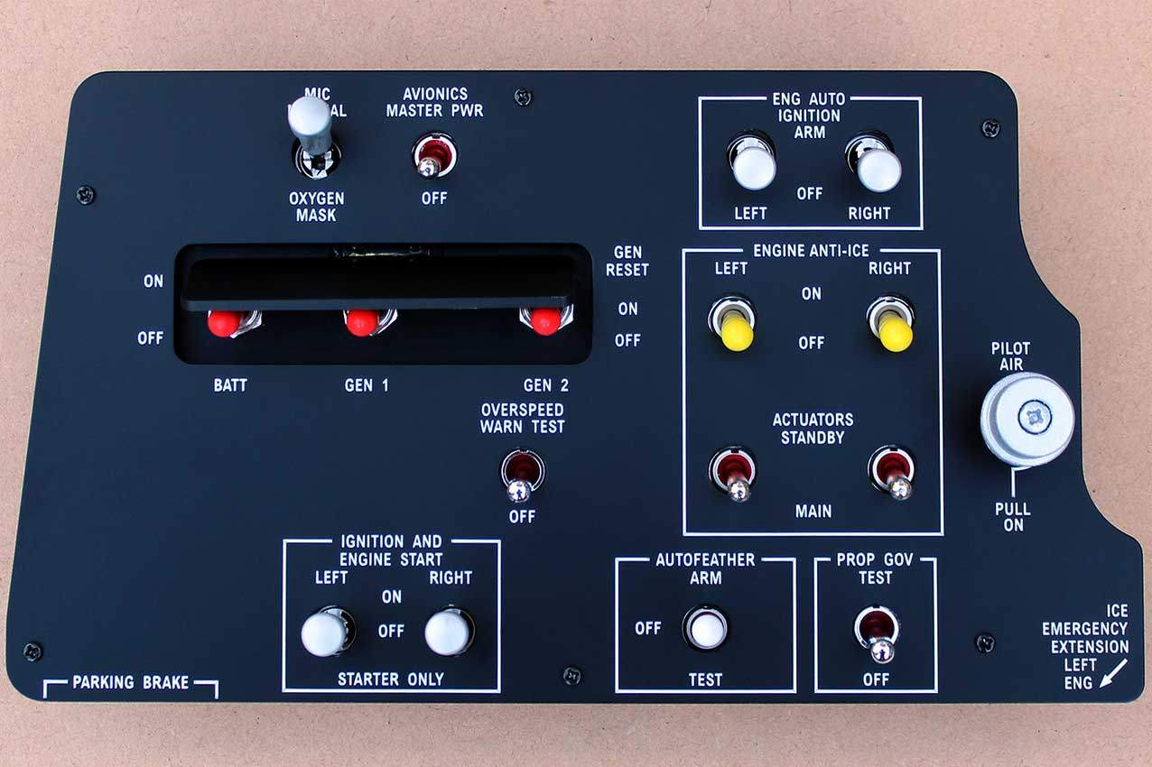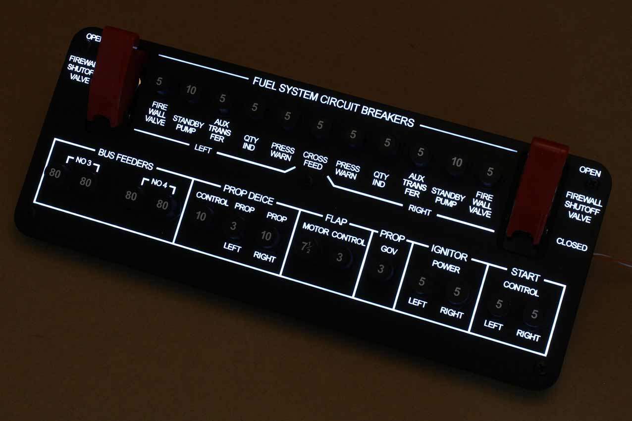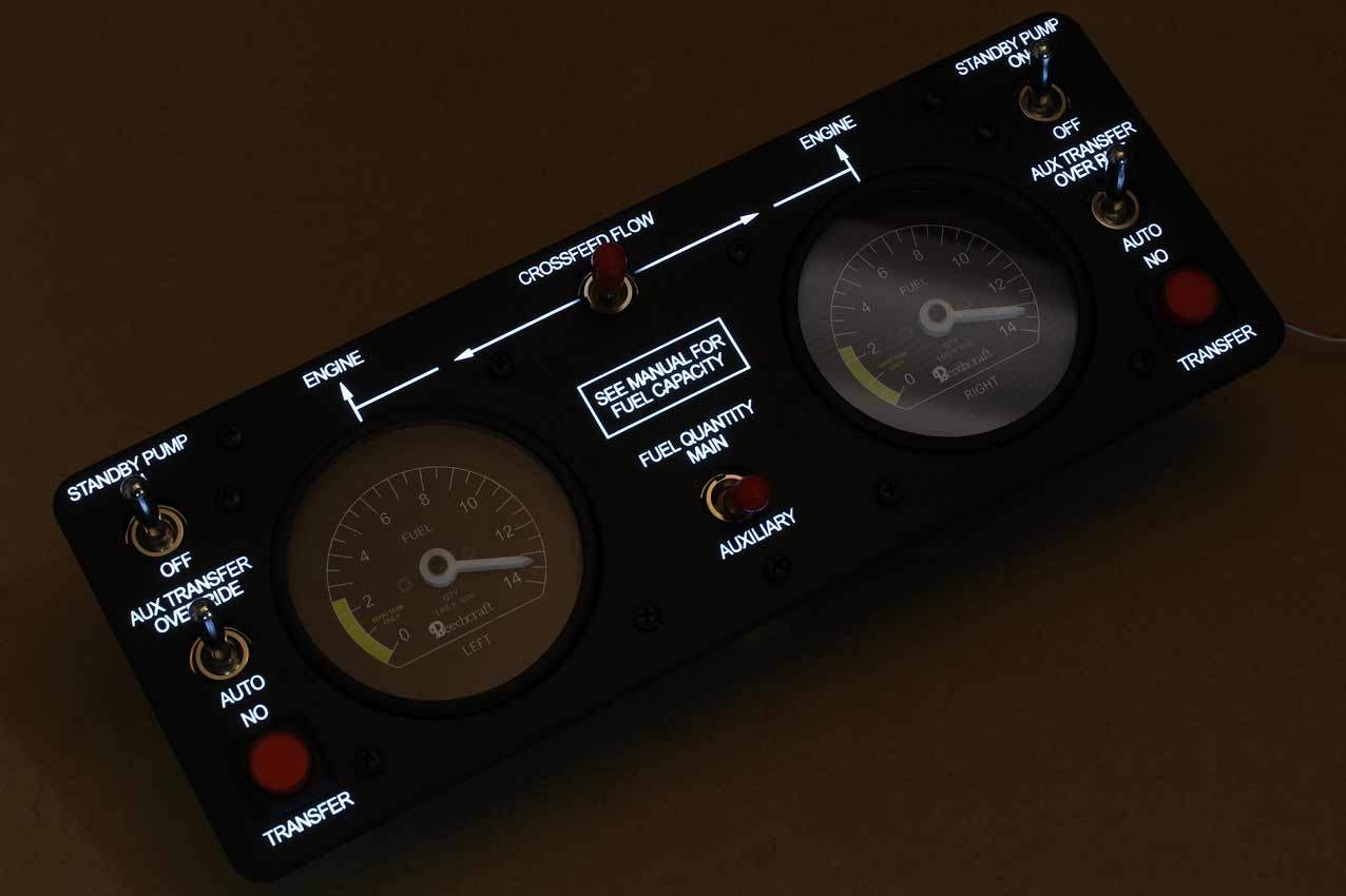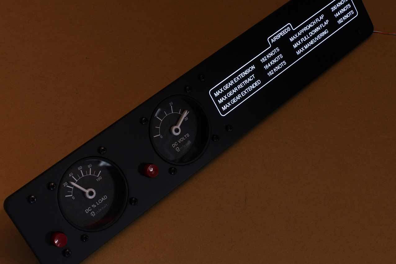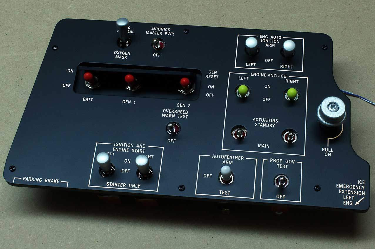 When supplied as a fully-assembled unit, this fully-backlit panel will include all of the switches (both the locking-lever and standard toggle versions), the black mounting screws, connection wires for the 12V backlighting, a dummy gauge, a pull on/push off switch, the Cabin Air knob, and knobs for the Cabin Temp, Cabin Temp Mode, and Fire Det & Fire Extinguisher. Please note that the hole for the gauge is suitable for a GSA-057 gauge from Flight Illusion.