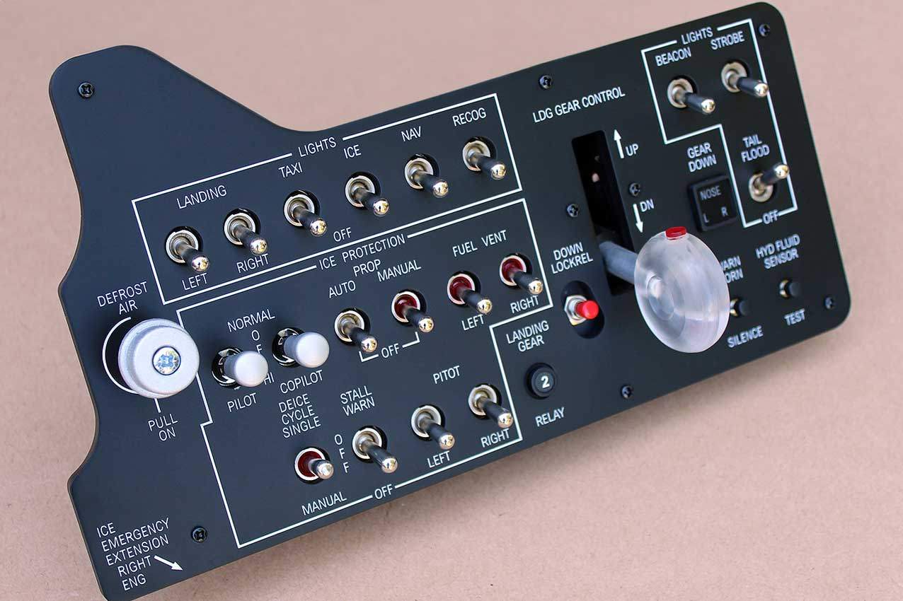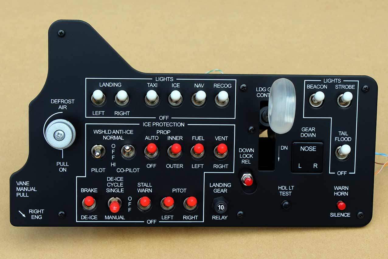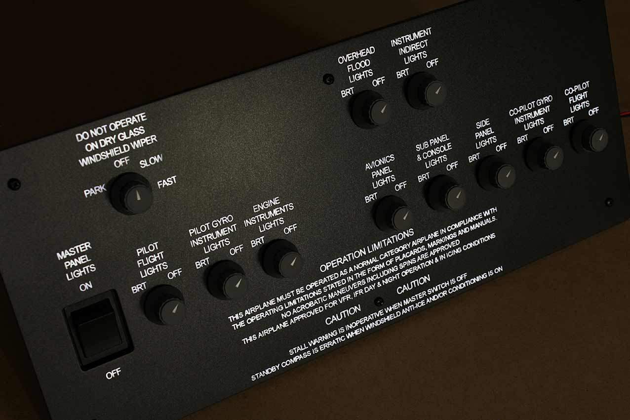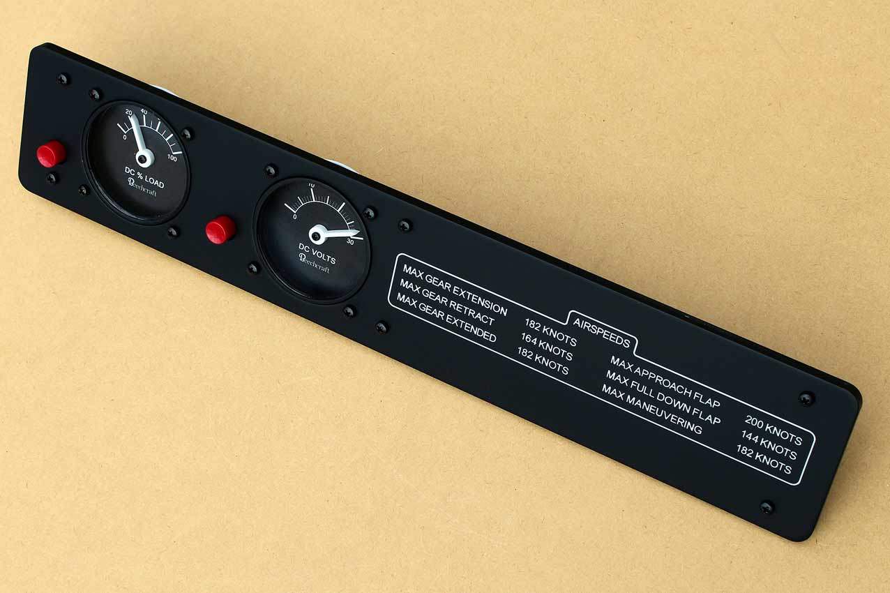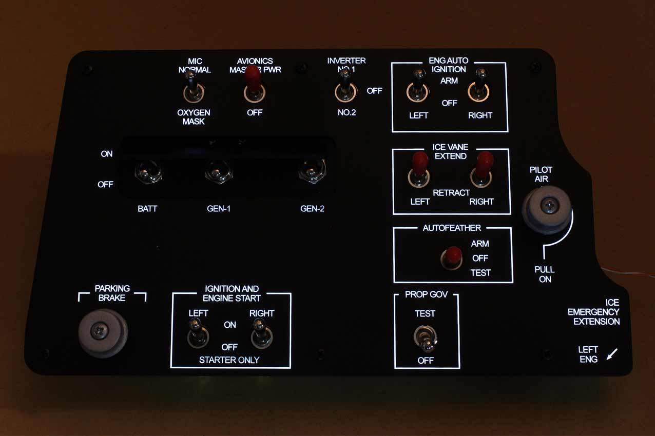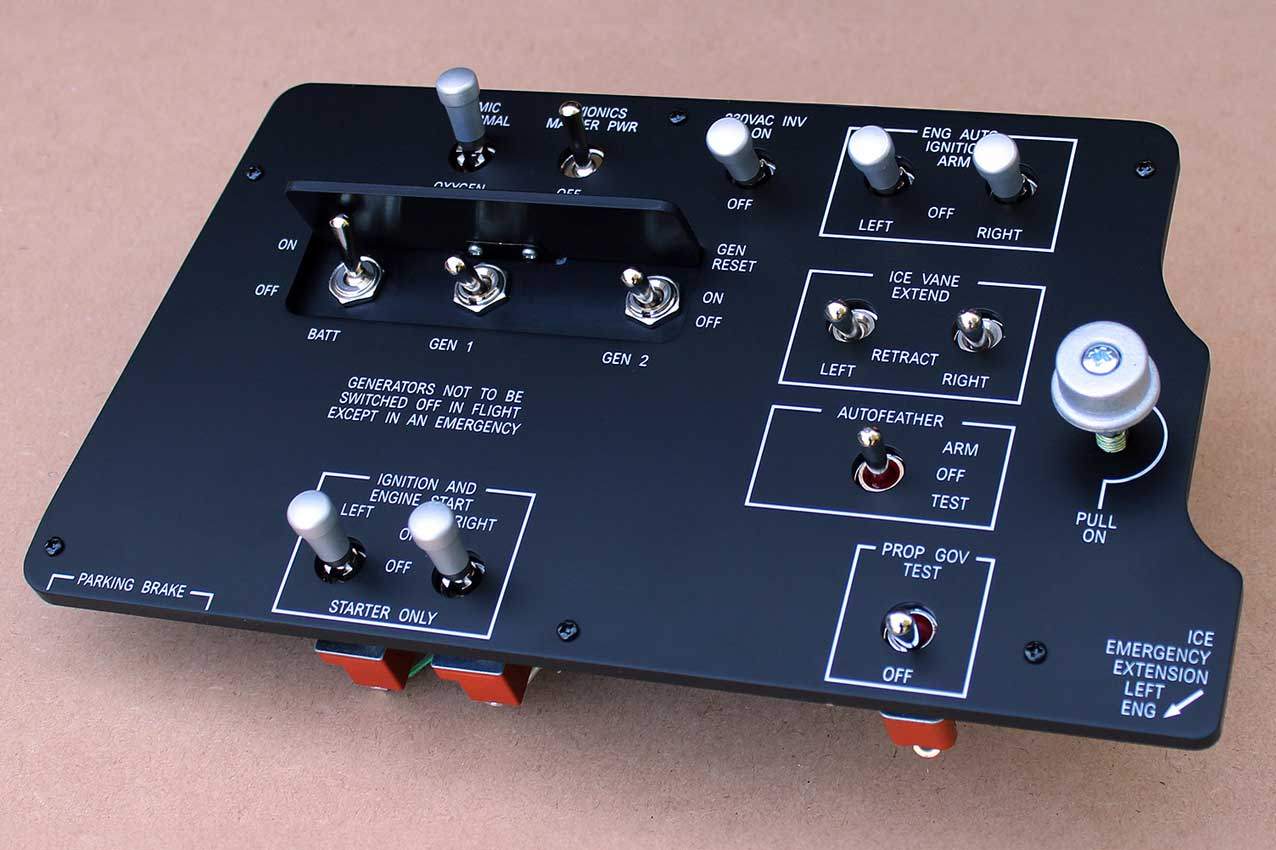 When supplied as a fully-assembled unit, this fully-backlit panel will include all of the switches (both the locking-lever and standard toggle versions), the black mounting screws, connection wires for the 12V backlighting, a dummy gauge, a pull on/push off switch, the Cabin Air knob, and knobs for the Cabin Temp, Cabin Temp Mode, and Fire Det & Fire Extinguisher. Please note that the hole for the gauge is suitable for a GSA-057 gauge from Flight Illusion.