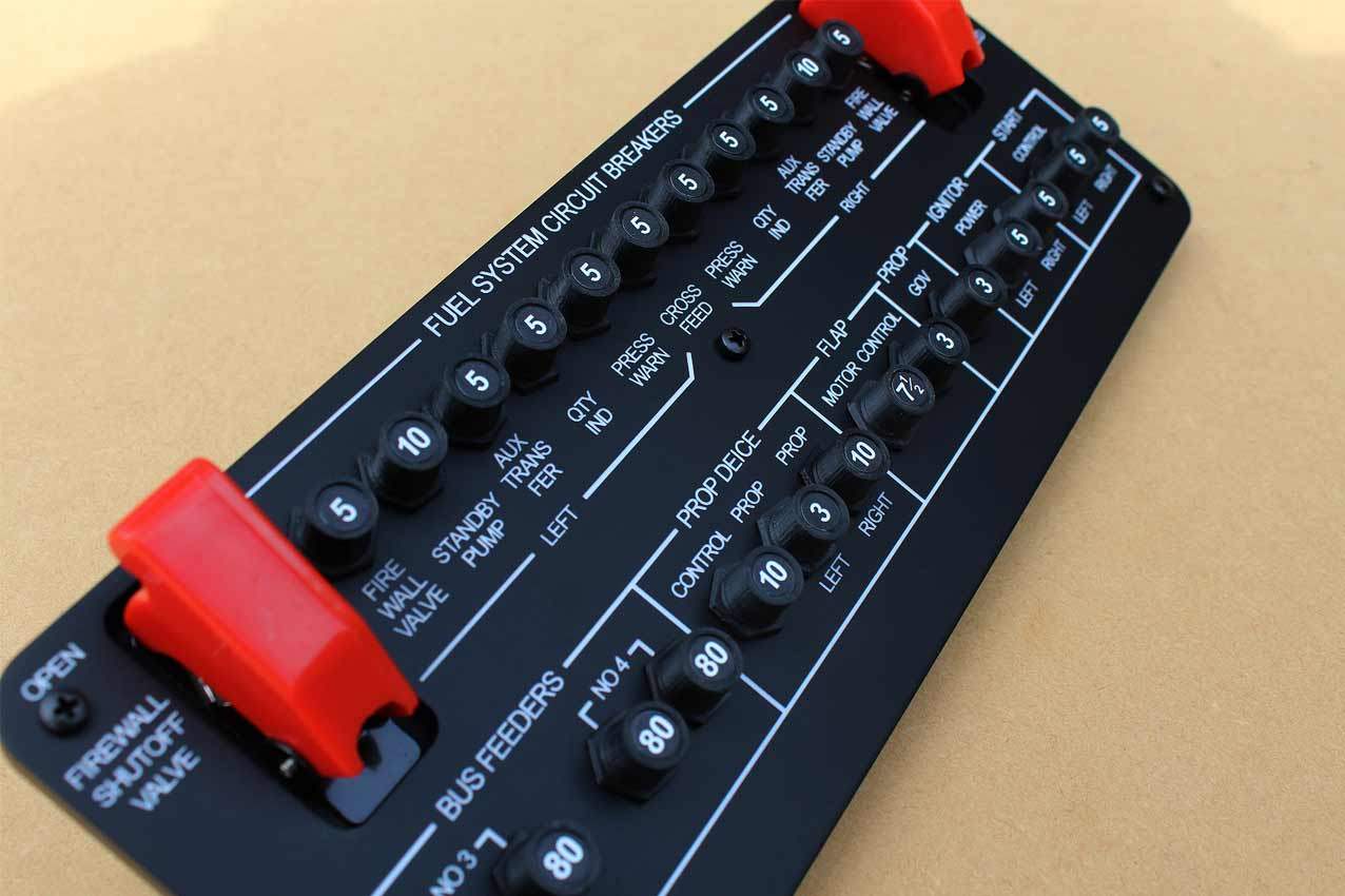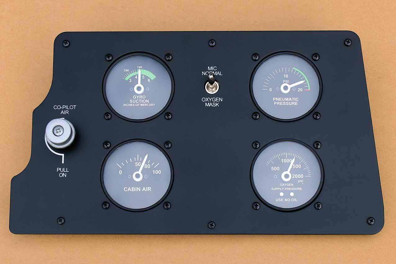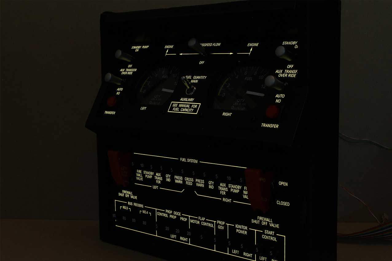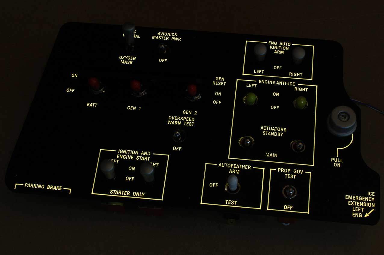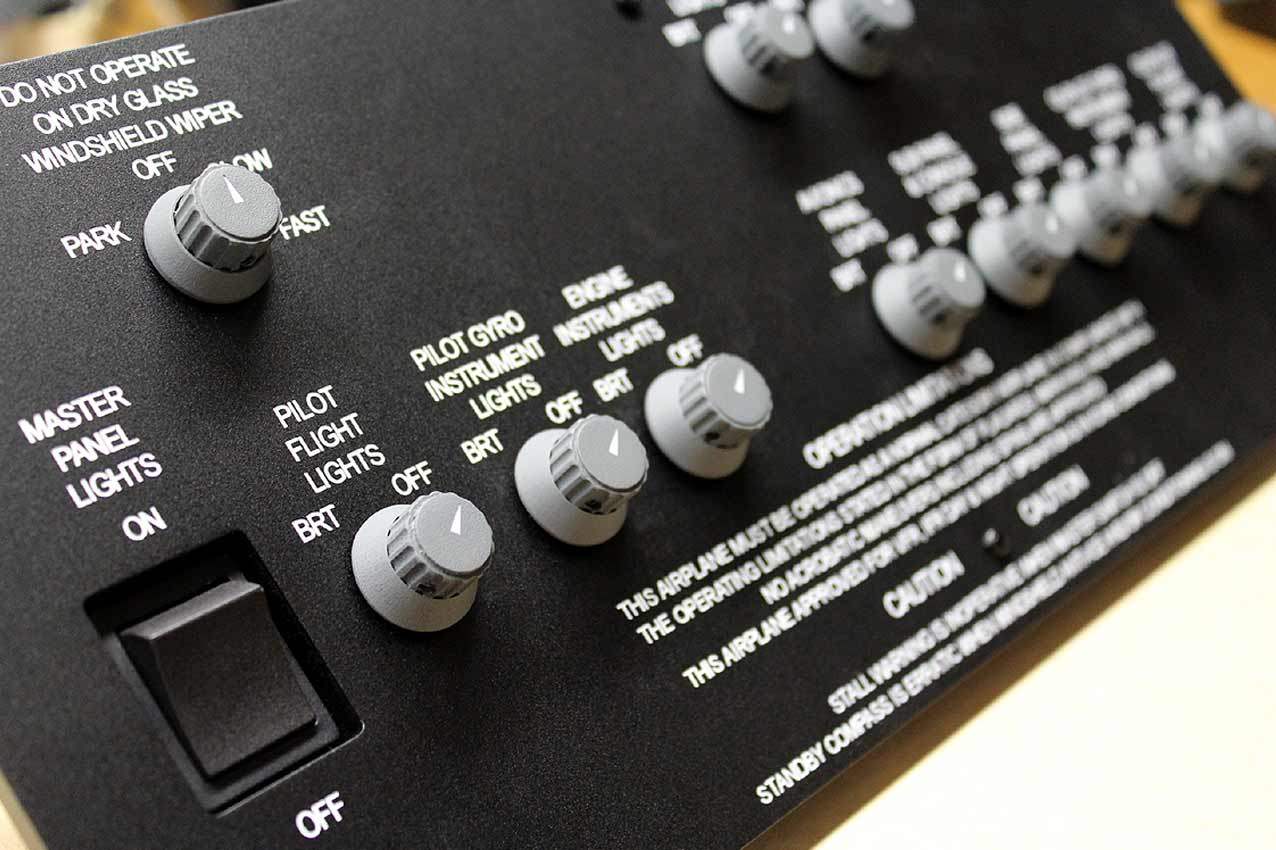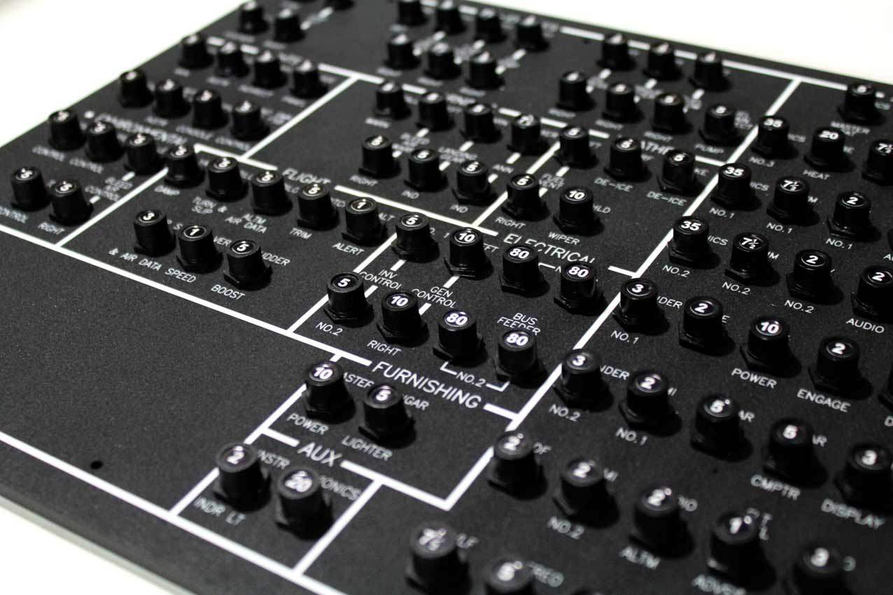 When supplied as a fully-assembled unit, this fully-backlit panel will include all of the switches (both the locking-lever and standard toggle versions), the black mounting screws, connection wires for the 12V backlighting, a dummy gauge, a pull on/push off switch, the Cabin Air knob, and knobs for the Cabin Temp, Cabin Temp Mode, and Fire Det & Fire Extinguisher. Please note that the hole for the gauge is suitable for a GSA-057 gauge from Flight Illusion.