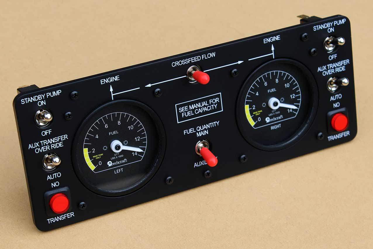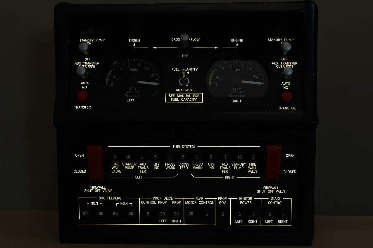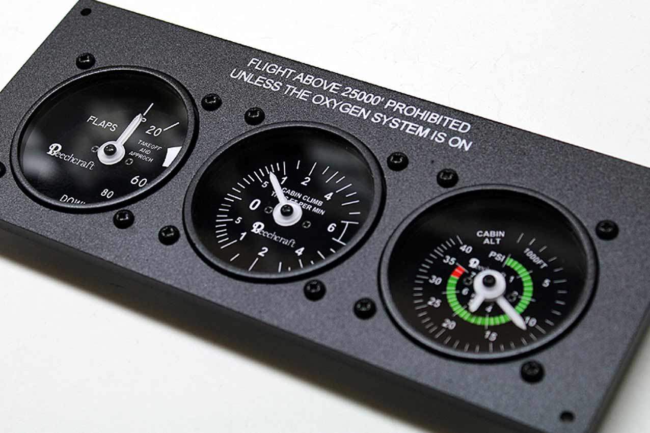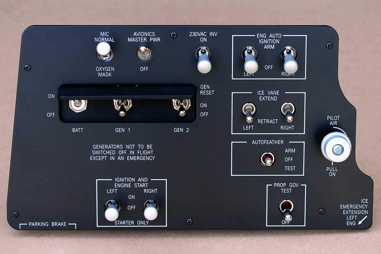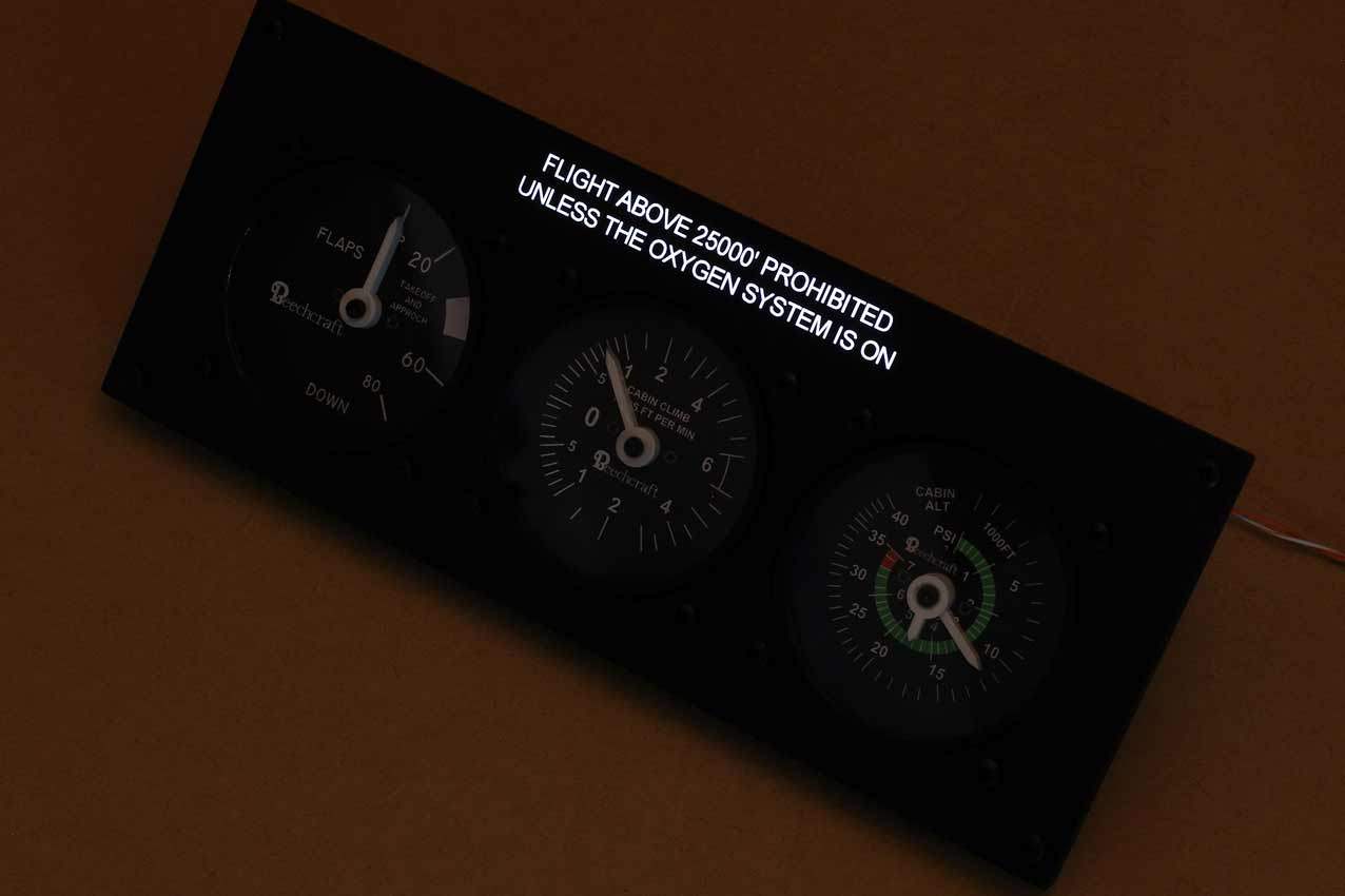 When supplied as a fully-assembled unit, this fully-backlit panel will include all of the switches (both the locking-lever and standard toggle versions), the black mounting screws, connection wires for the 12V backlighting, a dummy gauge, a pull on/push off switch, the Cabin Air knob, and knobs for the Cabin Temp, Cabin Temp Mode, and Fire Det & Fire Extinguisher. Please note that the hole for the gauge is suitable for a GSA-057 gauge from Flight Illusion.