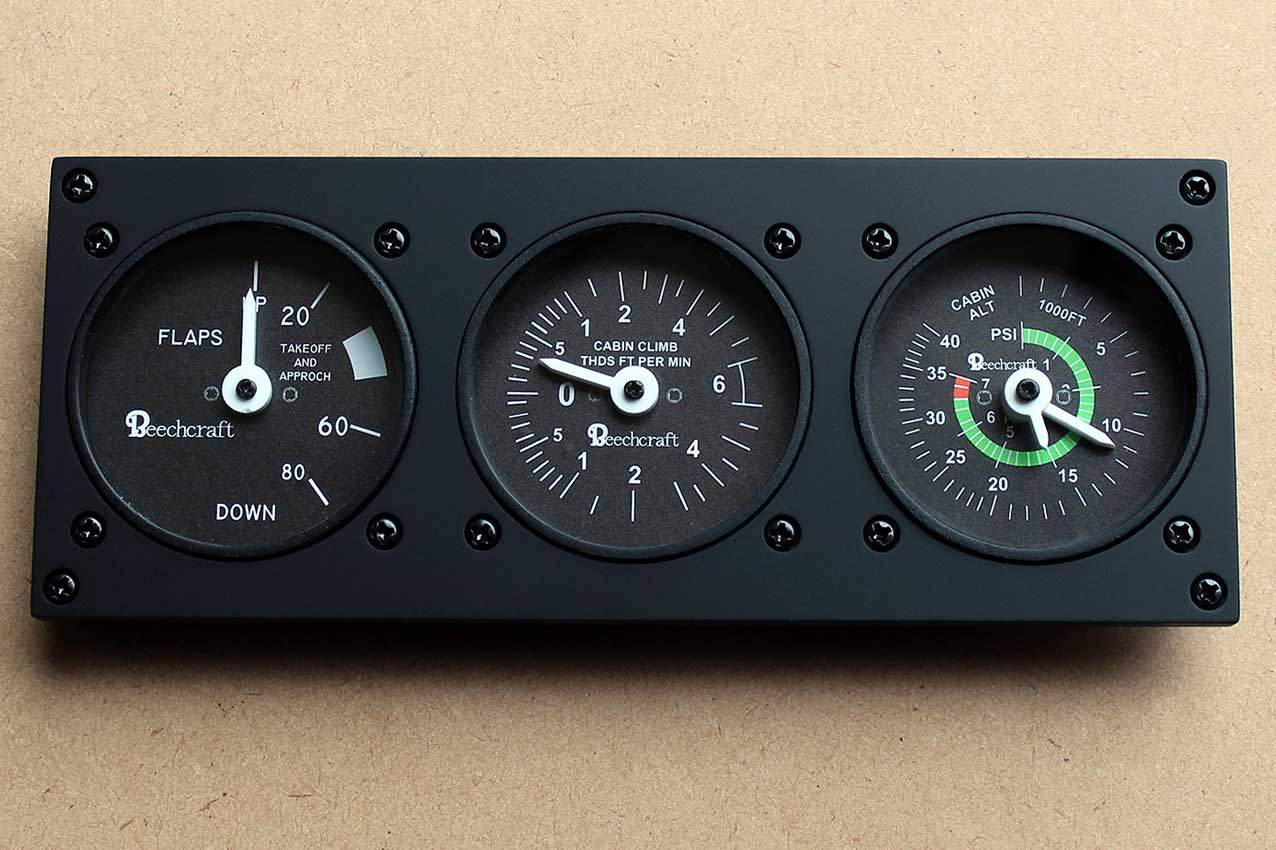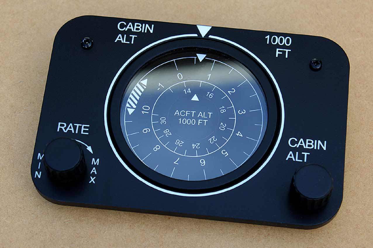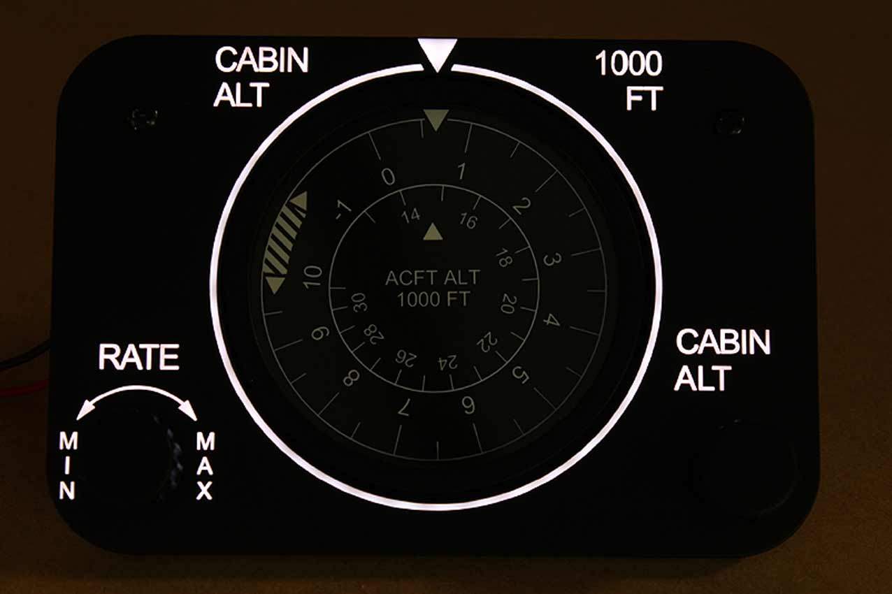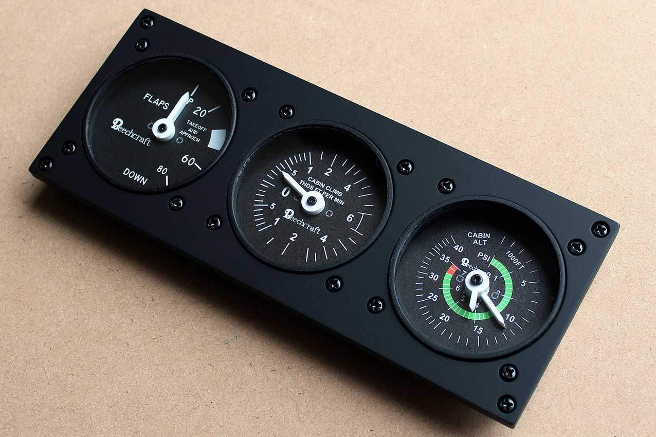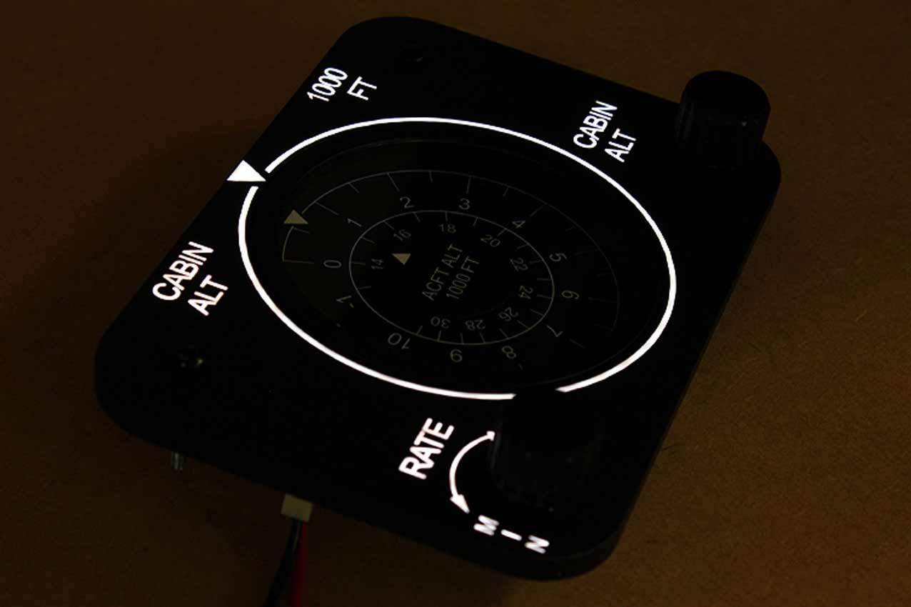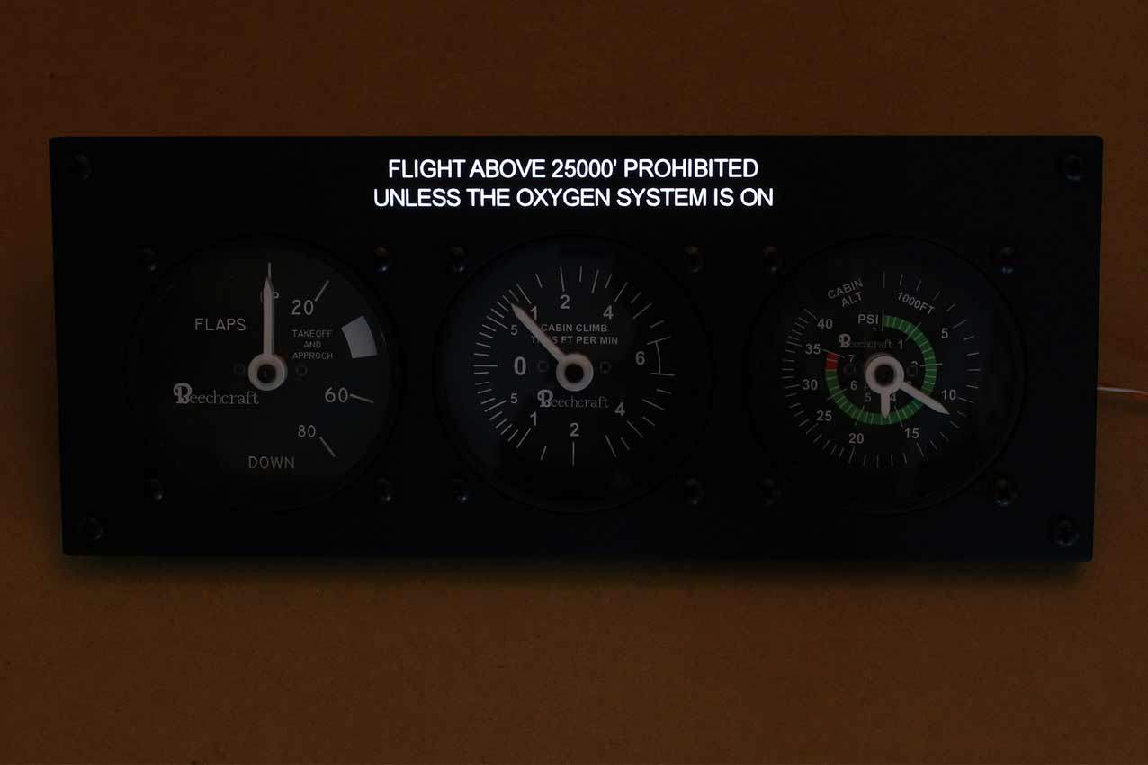 When supplied as a fully-assembled unit, this fully-backlit panel will include all of the switches (both the locking-lever and standard toggle versions), the black mounting screws, connection wires for the 12V backlighting, a dummy gauge, a pull on/push off switch, the Cabin Air knob, and knobs for the Cabin Temp, Cabin Temp Mode, and Fire Det & Fire Extinguisher. Please note that the hole for the gauge is suitable for a GSA-057 gauge from Flight Illusion.
