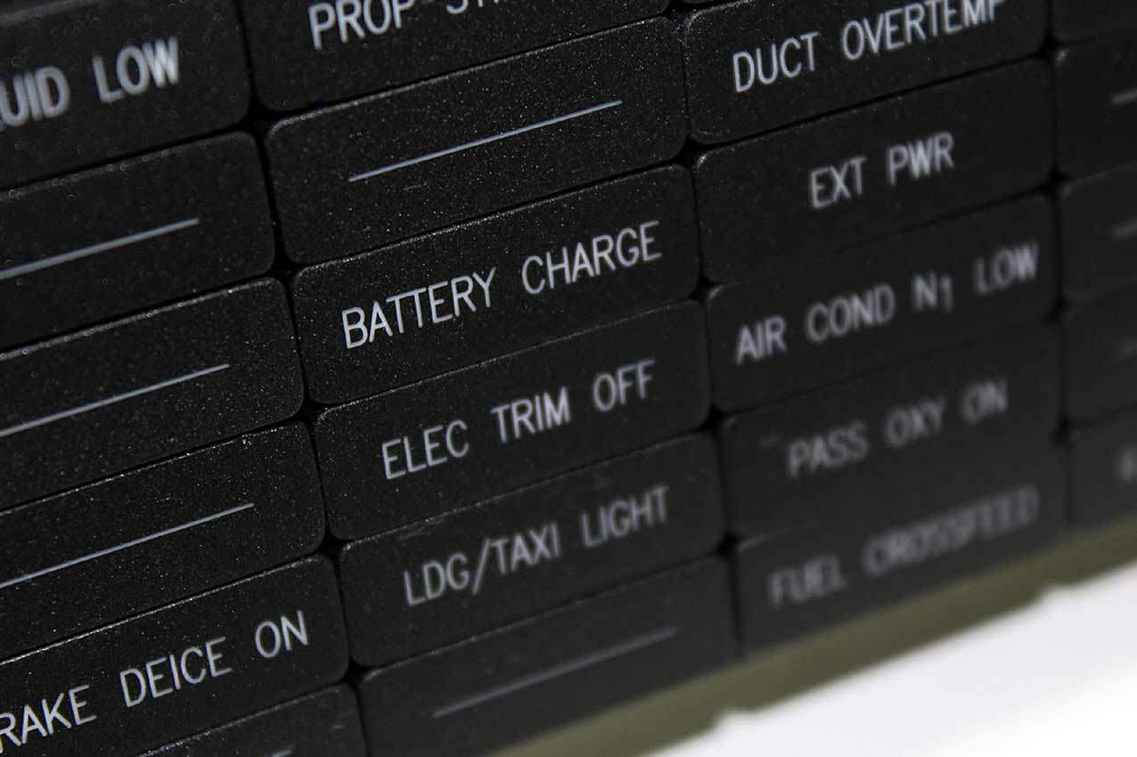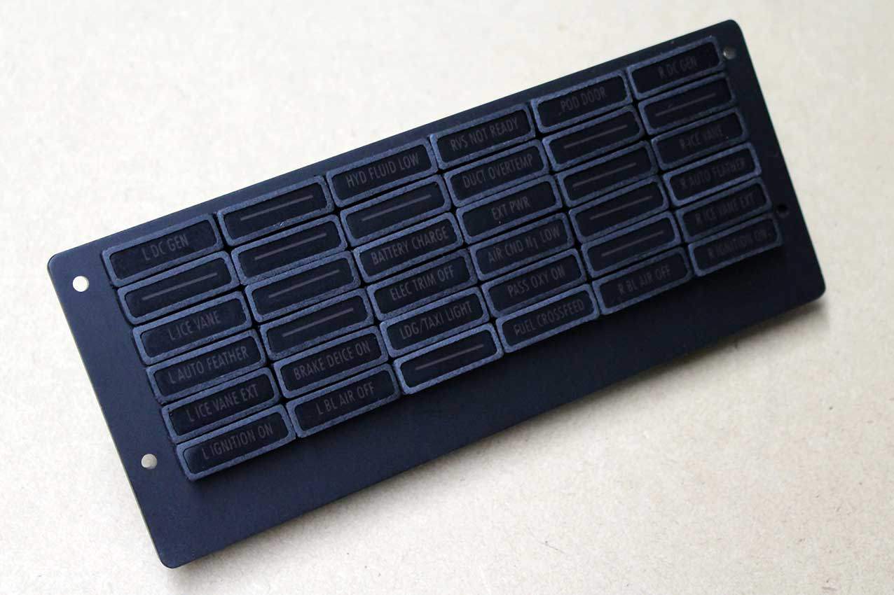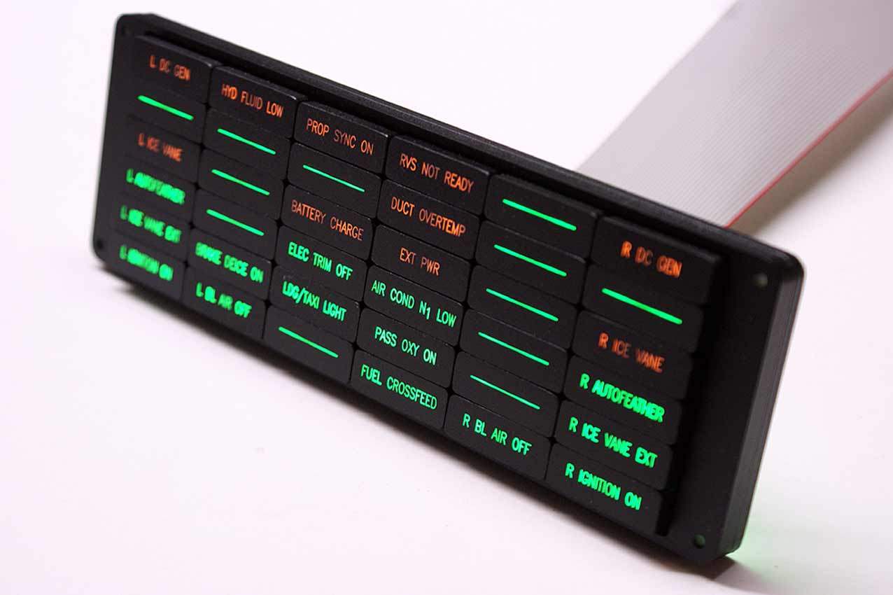 The Glareshield Annunciator Panel is shipped complete with a fully-populated LED circuit board, although there is no interface board supplied. There is a multi-Pin header on the rear of the LED circuit board to allow you to connect this to your own connector/controller board(s) or you can purchase one of our annunciator controller boards here.